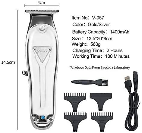 The VGR Original Professional Hair Clipper Sets your ticket to a perfect haircut anytime, anywhere. This cordless, adjustable, and rechargeable trimmer is all you need for salon-quality results in the comfort of your home. Crafted with a stainless steel precision blade and a titanium cover, it delivers durability and precise cutting. Plus, it comes with two combs, a cleaning brush, shaver oil, and an easy-to-follow instruction booklet for your convenience.