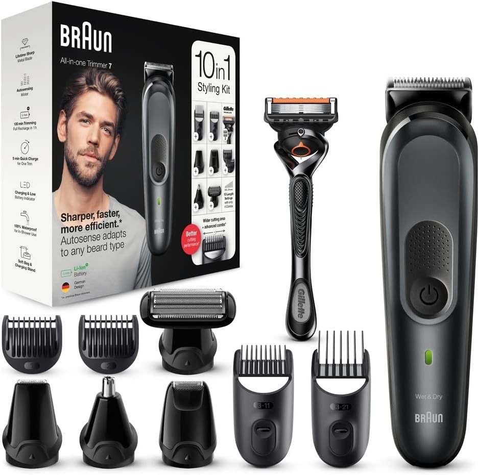 Braun All-in-one Trimmer 7 MGK7321, 10-in-1 Trimmer, 100min runtime, 8 Attachments, and Gillette ProGlide Razor – International Warranty
