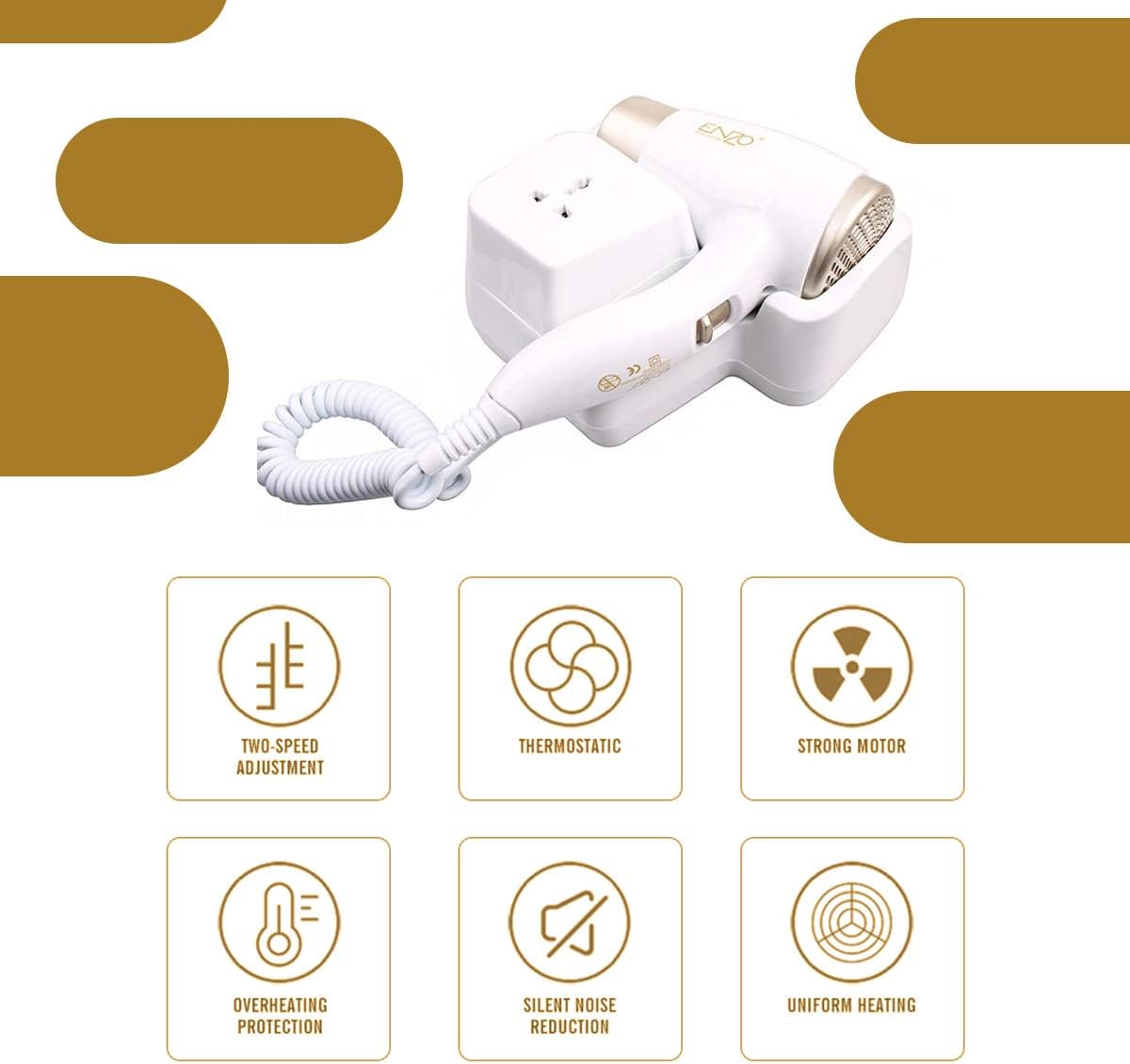 This dryer is designed with a unique air outlet -Removable air intake grill for easy cleaning -Wind power regulation switch, temperature control switch -Overheating protection device Wall hair dryer Hotel hair dryer