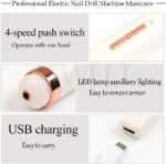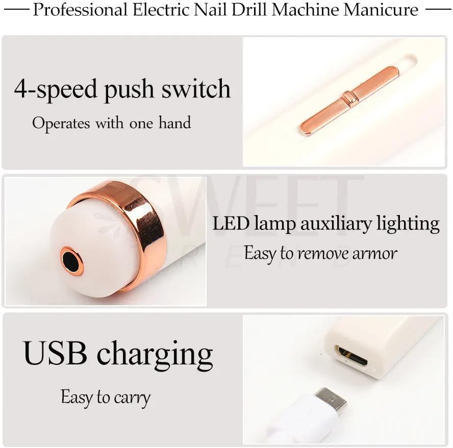 Electric Nail Drill: The electric nail file set has 5 different trimming heads, which can be charged with USB adapter. Strong strength and different gears can be adjusted to meet the needs of different people. Can be used for nails, pedicures, and plastic. Shape, polish, and remove excess stratum corneum or nail care for pets ..etc.